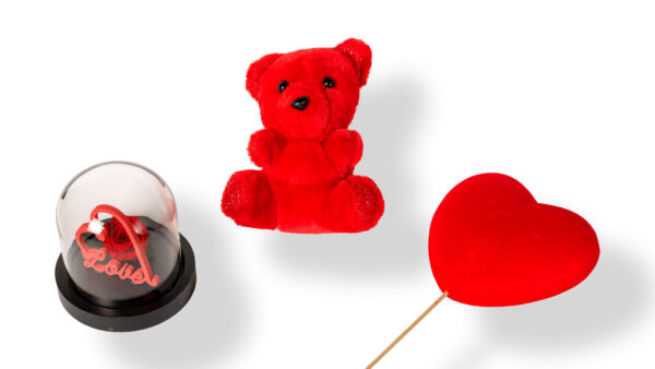 Paper Bag With Heart, Gusmania In Jar, Small Red Teddy Bear, Rose