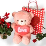 • Paper Bag with Heart, Large Pink Teddy Bear, 1 Cyclamen, 1 Rose