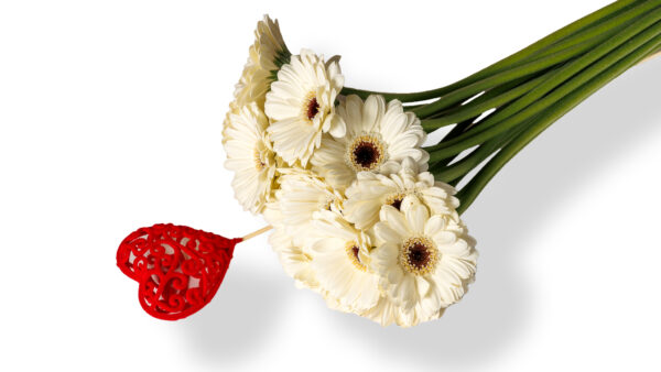 Ανθοδέσμη με 10 Λευκά Ζερμπερίνια και Στικ Καρδιάς