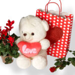 Σακούλα με Καρδιά, Κυκλάμινο, Μεγάλο Λούτρινο Λευκό Αρκουδάκι και Τριαντάφυλλο