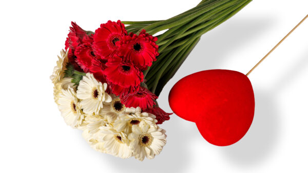 Ανθοδέσμη με 20 Λευκές και Κόκκινες Ζέρμπερες και Στικ Καρδιάς