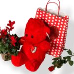 Χάρτινη Σακούλα με Καρδιά, Γκουσμανια Σε Βάζο, Μικρό Κόκκινο Λουτρινο Αρκουδάκι, Τριαντάφυλλο