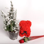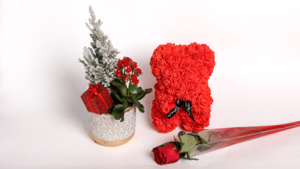 Δεντράκι χιονισμένο με καλαχοη μικρή και τριαντάφυλλο κόκκινο και αρκουδάκι rose Bear