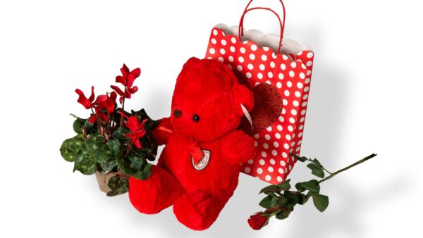 • Σακούλα Χάρτινη με Καρδιά, μεγάλο Κόκκινο Λουτρινο Αρκουδάκι, 1 Κυκλαμινο, 1 Τριαντάφυλλο