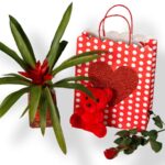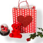 Χάρτινη Σακούλα με Καρδιά, Γκουσμανια Σε Βάζο, Μικρό Κόκκινο Λουτρινο Αρκουδάκι, Τριαντάφυλλο